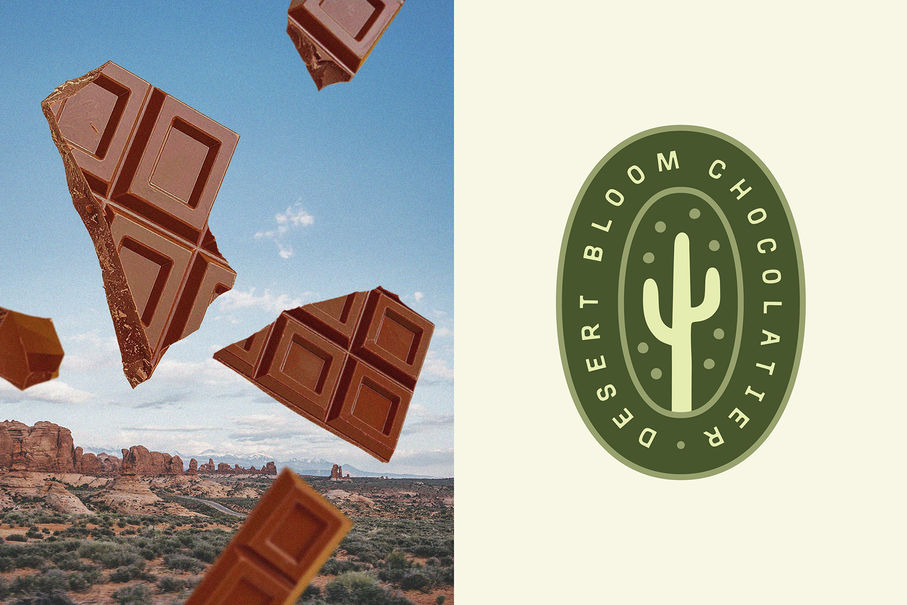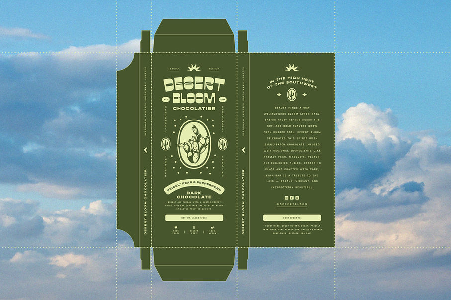 Desert Bloom is a small-batch chocolatier that celebrates the bold, resilient beauty of the Southwest. Drawing on regional flavors like prickly pear, mesquite, blue corn, and sun-dried chiles, each chocolate bar is uniquely crafted as a tribute to the land. Desert Bloom’s brand identity was carefully designed to capture this spirit. The logo suite balances sturdiness and warmth, while rustic typography and textured illustrations come together to convey the grit and charm of the Southwestern desert. The result is a brand world that feels rooted in place yet fresh and inviting, creating a distinctive shelf presence that tells a deeper story of land, flavor, and craft.
